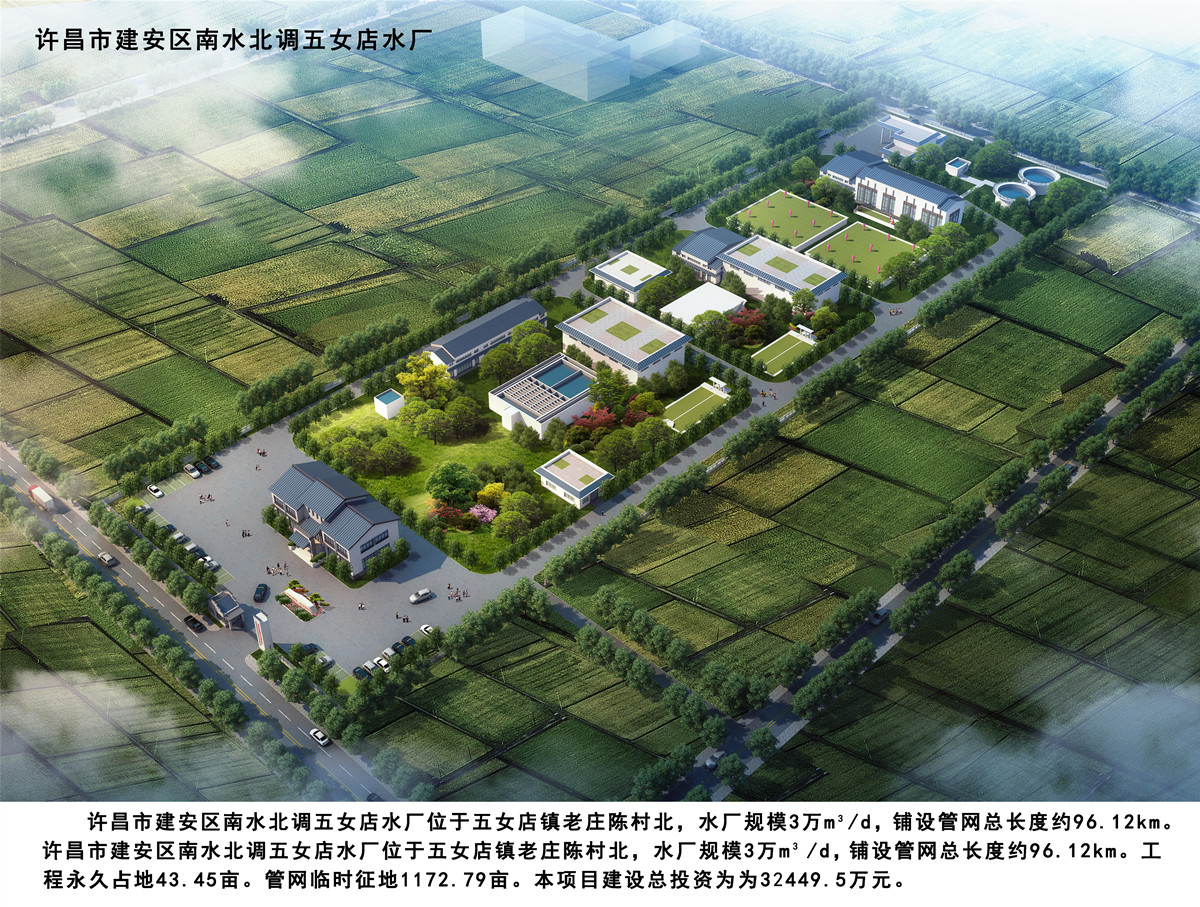 五女店水廠位于許昌市建安區,水廠規模3萬m³/d,配水管網按照一次規劃布置建設,鋪設管網總長度約96.12km。
