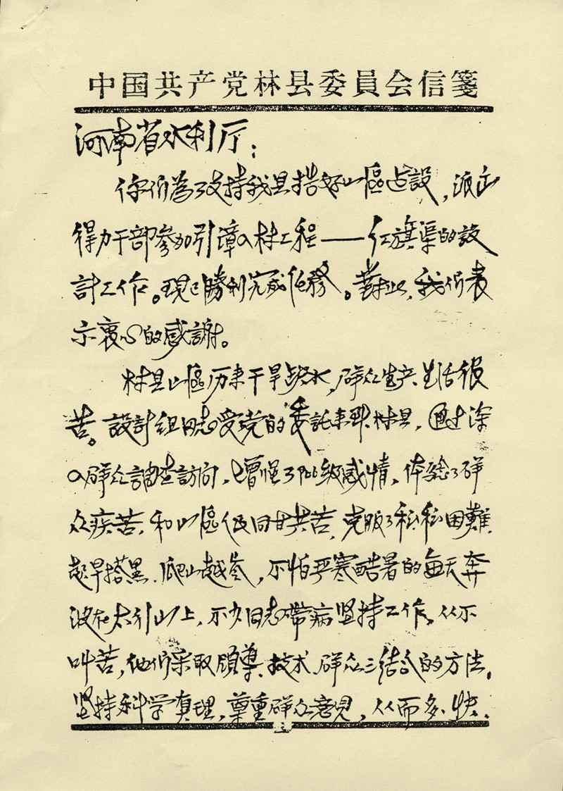 舉世聞名的人工天河——紅旗渠,原為林縣自辦工程,1960年因國家自然災(zāi)害而停工。省水利廳設(shè)計院受水利廳委托成立紅旗渠設(shè)計組,經(jīng)過三年的艱苦奮斗和科學(xué)設(shè)計,使紅旗渠建設(shè)列入國家基本建設(shè)項目。老一輩豫水設(shè)計人為紅旗渠的順利實施提供了有力的技術(shù)支撐,受到了省水利廳的嘉獎和林縣政府的書面表揚。工程設(shè)計流量23m3/s,設(shè)計灌溉面積54萬畝。