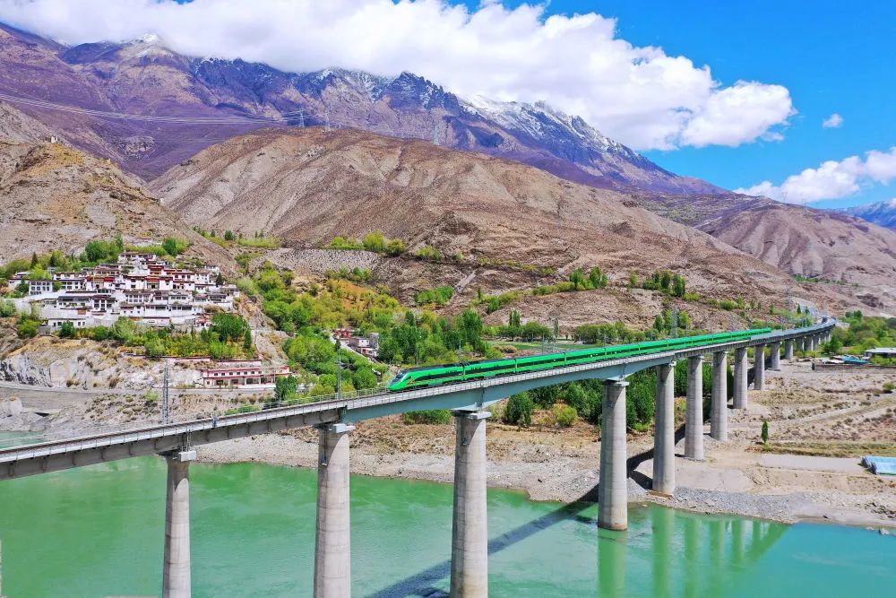 復(fù)興號列車行駛在西藏朗縣境內(nèi)(2022年4月14日攝)。新華社記者 覺果 攝