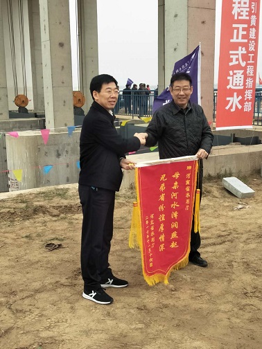 為慶祝工程基本完工并開始試通水,項(xiàng)目行政主管單位河北省水利廳在沉沙池進(jìn)口舉辦了簡(jiǎn)單的引黃入冀補(bǔ)淀工程通水儀式,河南省水利廳、黃河水利委員會(huì)、濮陽市人民政府以及各參建單位共百余人參加了通水儀式。我公司趙廷華副總經(jīng)理及現(xiàn)場(chǎng)設(shè)代作為設(shè)計(jì)方代表參加了該儀式。