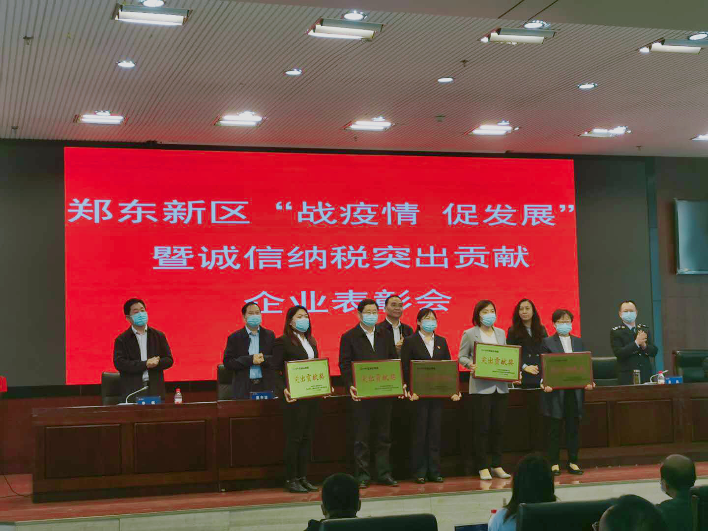 鄭東新區(qū)管委會(huì)主任周軍營和鄭東新區(qū)稅務(wù)局局長賈中誼參加會(huì)議并頒獎(jiǎng)。集團(tuán)公司翟淵軍董事長參加了頒獎(jiǎng)儀式,財(cái)務(wù)資產(chǎn)部馮海霞部長列席。