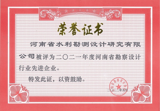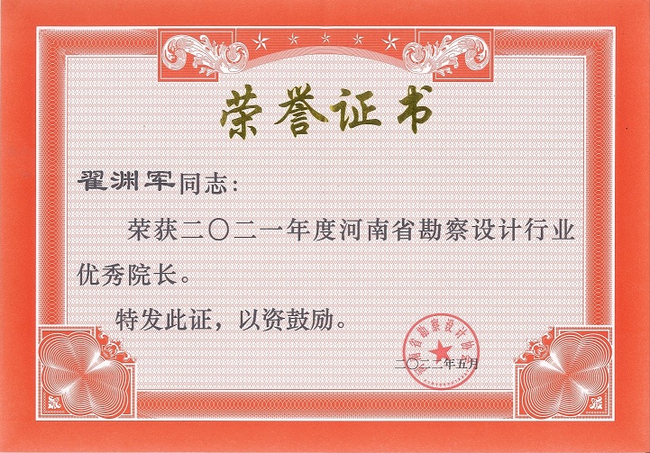 大會還對2021年表現優秀的勘察設計企業、院長頒發了榮譽證書。公司被評為2021年度河南省勘察設計行業先進企業,翟淵軍董事長榮獲2021年河南省勘察設計行業優秀院長。