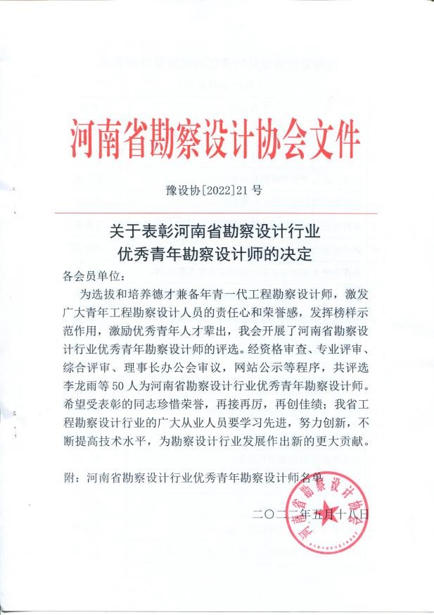 安增強、耿昕、劉曉琴同志獲得河南省勘察設計協會給予的“河南省優秀青年勘察設計師”表彰;寧保輝、馬山玉、白勇、魏常琦同志被河南省工程勘察設計行業協會列入“第一屆中原杰出青年勘察設計人才”培養名單;劉蘭勤、侯曉輝同志被河南省水利學會評為“中原水利英才”。