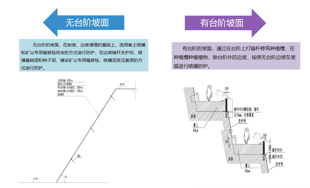根據不同的邊坡型式,綜合采用消坡、排險、錨固、掛網、噴播、種植穴/槽等不同的技術措施,以及藤、灌、草等多種植物搭配組合,實現邊坡復綠與生境的自我修復和構建。