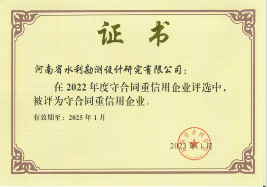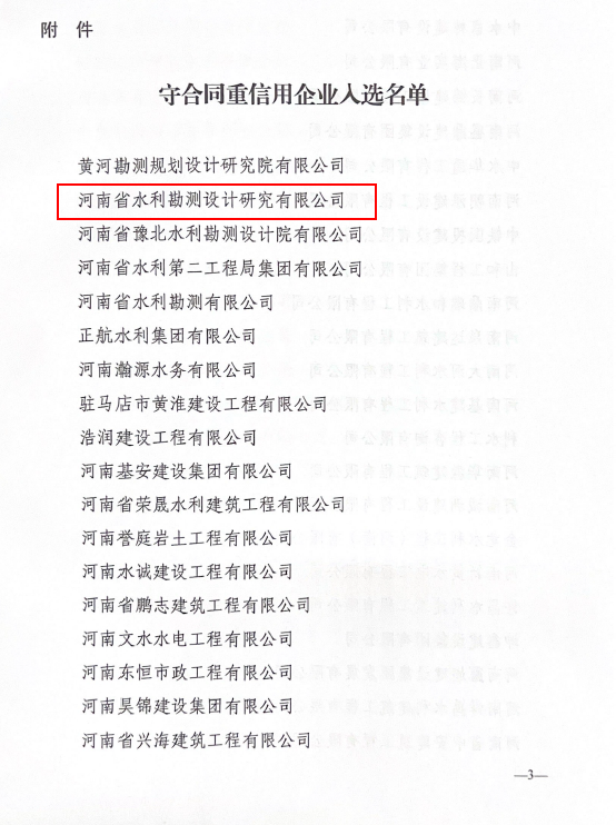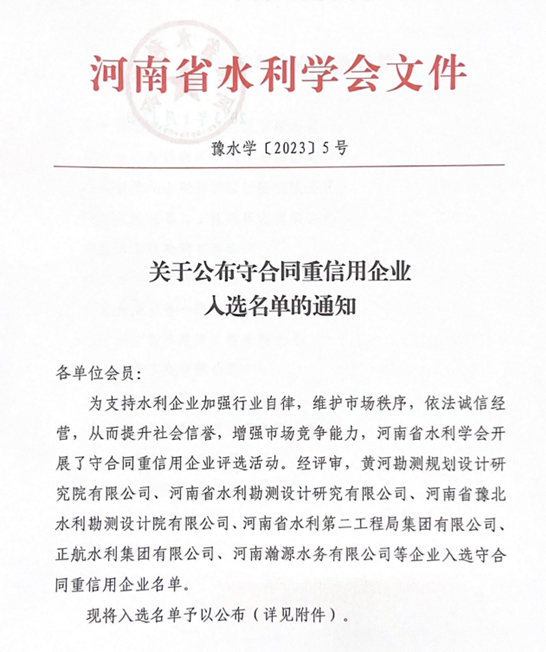 近日,河南省水利學(xué)會(huì)公布守合同重信用企業(yè)入選名單,豫水設(shè)計(jì)公司被評(píng)為“守合同重信用企業(yè)”。