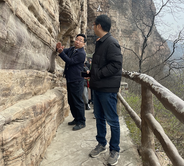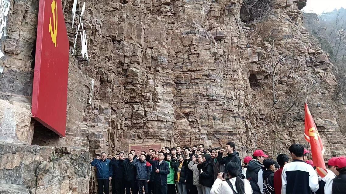 在青年洞,大家沿著“創業路”拾級而上,追憶著半個多世紀前先輩們在此奮斗的足跡:在紅旗渠修建過程中,300名青年組成突擊隊,經過1年5個月的奮戰,將地勢險要、石質堅硬的巖壁鑿通,這個輸水隧洞被命名為青年洞。青年洞現場,面對鮮艷的五星紅旗,全體黨員舉起右拳,在支部書記楊華軍的帶領下,重溫入黨誓詞,堅定了我們緊跟總書記的步伐,奮進新征程的信念和決心。