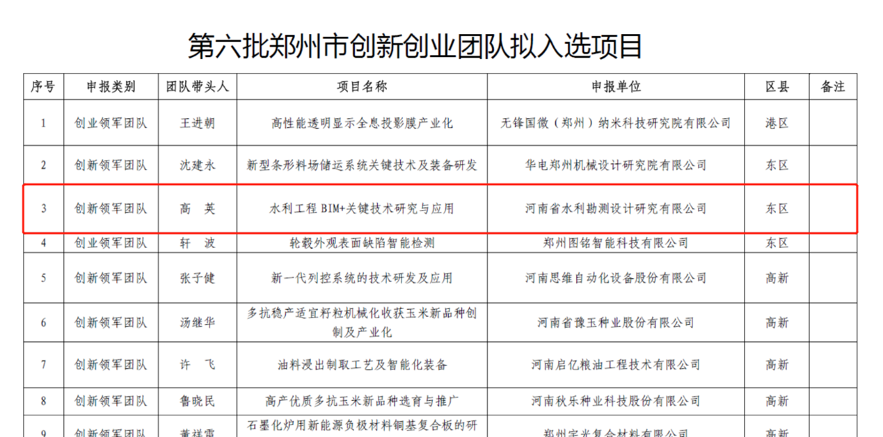 近日,根據鄭州市科技局“第六批鄭州市創新創業團隊項目擬入選項目公示”,我公司副總經理高英帶領團隊開展的“水利工程BIM+關鍵技術研究與應用”入選2023年第六批鄭州市“創新領軍團隊項目”。
