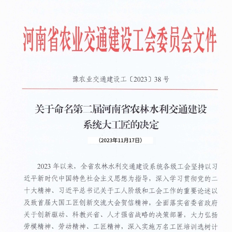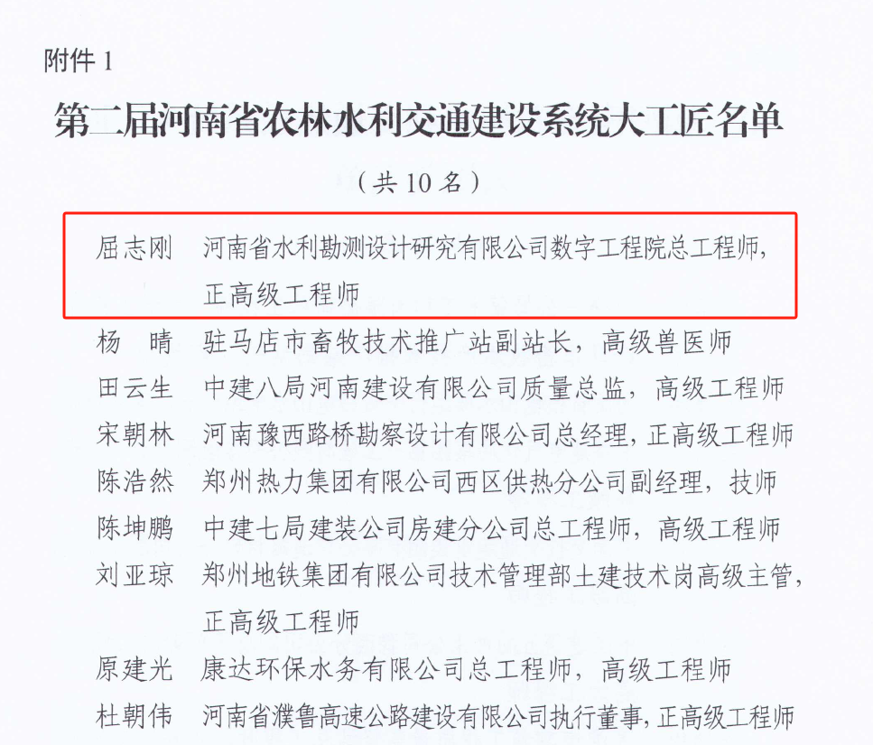 11月17日,河南省農(nóng)業(yè)交通建設(shè)工會(huì)委員發(fā)布命名決定,豫水設(shè)計(jì)公司數(shù)字工程院總工屈志剛同志被命名為第二屆河南省農(nóng)林水利交通建設(shè)系統(tǒng)大工匠,獎(jiǎng)勵(lì)個(gè)人1萬元。本屆評(píng)選,由公司申報(bào)、水投集團(tuán)推薦,屈志剛同志從眾多申報(bào)者中脫穎而出,為公司贏得榮譽(yù)。