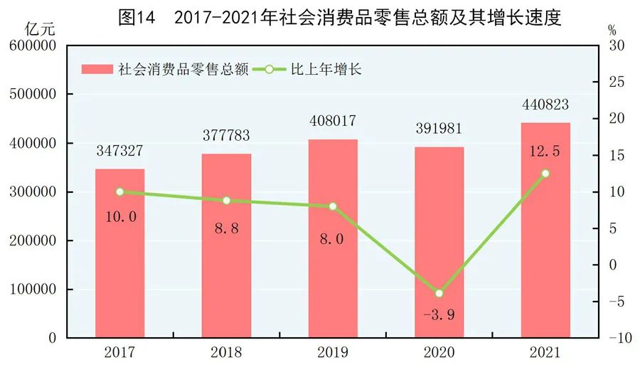 全年社會消費品零售總額440823億元,比上年增長12.5%。按經營地統計,城鎮消費品零售額381558億元,增長12.5%;鄉村消費品零售額59265億元,增長12.1%。按消費類型統計,商品零售額393928億元,增長11.8%;餐飲收入額46895億元,增長18.6%。