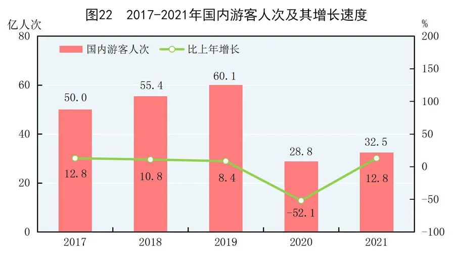 全年國內游客32.5億人次,比上年增長12.8%。其中,城鎮居民游客23.4億人次,增長13.4%;農村居民游客9.0億人次,增長11.1%。國內旅游收入29191億元,增長31.0%。其中,城鎮居民游客花費23644億元,增長31.6%;農村居民游客花費5547億元,增長28.4%。