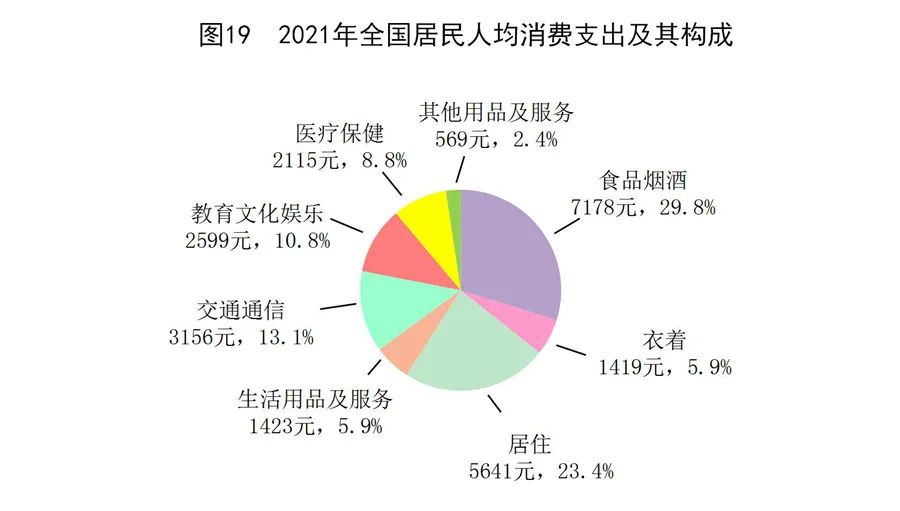 全年全國居民人均消費支出24100元,比上年增長13.6%,扣除價格因素,實際增長12.6%。其中,人均服務性消費支出10645元,比上年增長17.8%,占居民人均消費支出的比重為44.2%。按常住地分,城鎮居民人均消費支出30307元,增長12.2%,扣除價格因素,實際增長11.1%;農村居民人均消費支出15916元,增長16.1%,扣除價格因素,實際增長15.3%。全國居民恩格爾系數為29.8%,其中城鎮為28.6%,農村為32.7%。