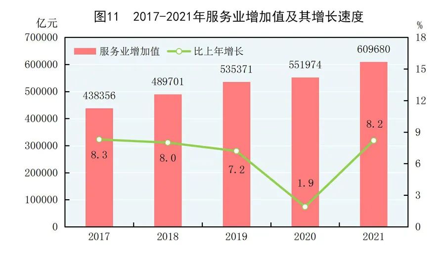 全年批發和零售業增加值110493億元,比上年增長11.3%;交通運輸、倉儲和郵政業增加值47061億元,增長12.1%;住宿和餐飲業增加值17853億元,增長14.5%;金融業增加值91206億元,增長4.8%;房地產業增加值77561億元,增長5.2%;信息傳輸、軟件和信息技術服務業增加值43956億元,增長17.2%;租賃和商務服務業增加值35350億元,增長6.2%。全年規模以上服務業企業營業收入比上年增長18.7%,利潤總額增長13.4%。